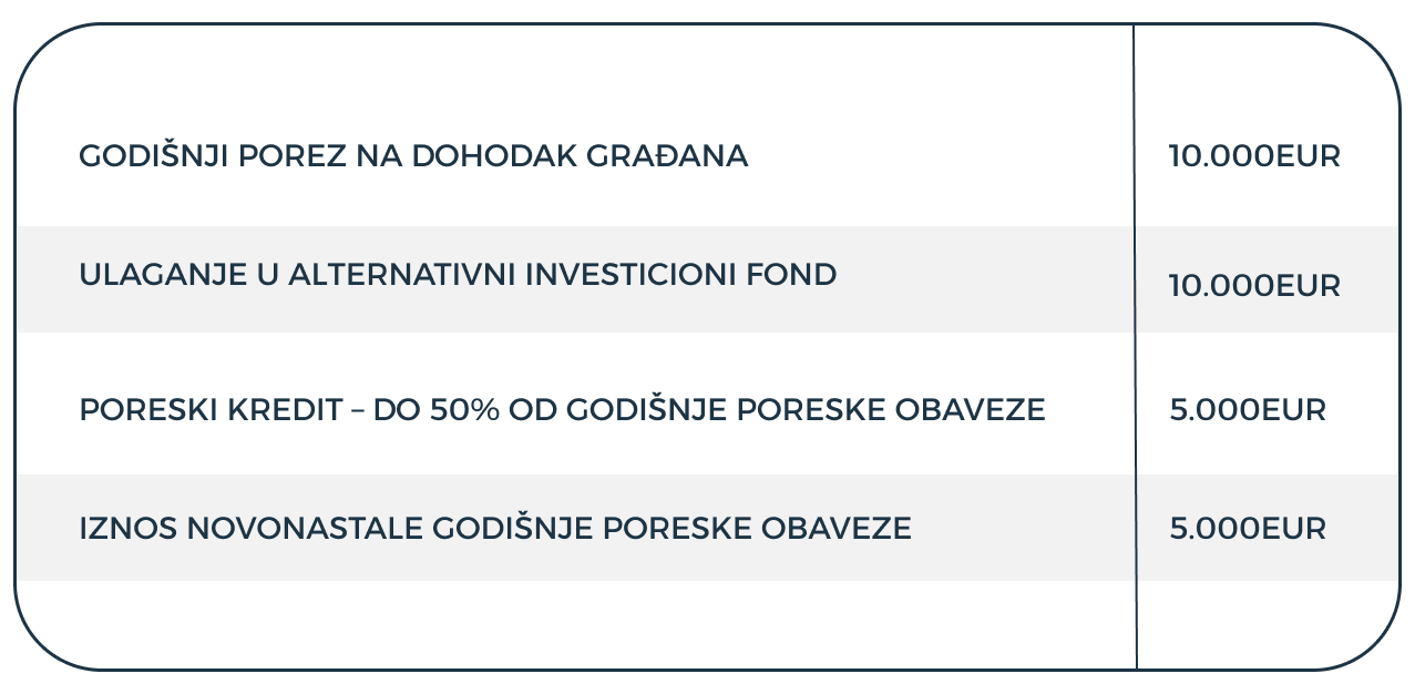 Ulaganjem u alternativni investicioni fond, klijent koji ima obavezu po osnovu godišnjeg poreza na dohodak građana 10.000 EUR, nakon ulaganja u alternativni investicioni fond u visini poreske obaveze umanjuje svoju poresku obavezu, maksimalno do 50%. U našem primeru za 5.000 EUR.